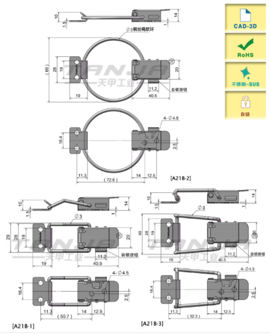 搭扣獨特的自鎖機構設計,防止搭扣在使用過程中彈開,使用方便安全