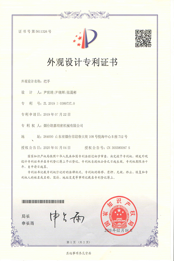 坦嘉精密于2020年2月4日,把手L43外觀設(shè)計(jì)專利順利通過(guò)國(guó)家知識(shí)產(chǎn)權(quán)局審查并獲得授權(quán),在公司團(tuán)隊(duì)不斷努力下,我司在產(chǎn)品自主設(shè)計(jì)和創(chuàng)新方面又一次取得專業(yè)性的突破。