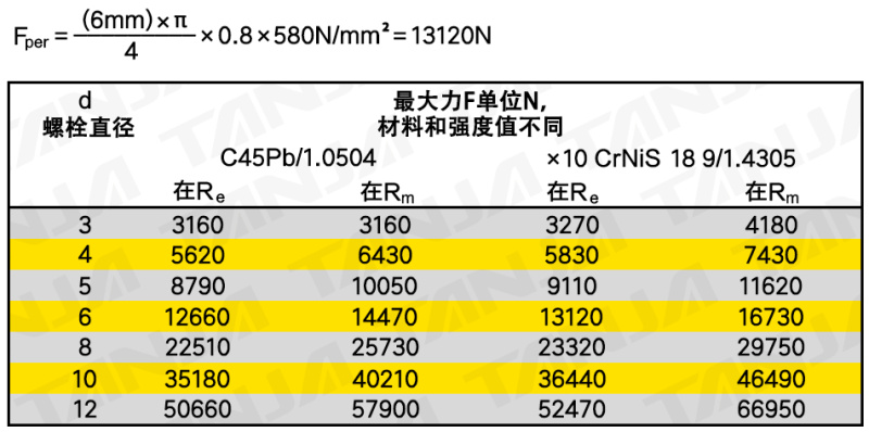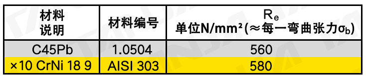 下表所示拉伸強(qiáng)度(Rm)和屈服強(qiáng)度或條件屈服強(qiáng)度(Re / Rp0.2 )為拉伸試樣按照DIN 50125-B6-30標(biāo)準(zhǔn)進(jìn)行拉伸試驗(yàn)后得到的測(cè)定值。這些測(cè)試數(shù)據(jù)構(gòu)成了此處給出的承載明細(xì)的基礎(chǔ)。