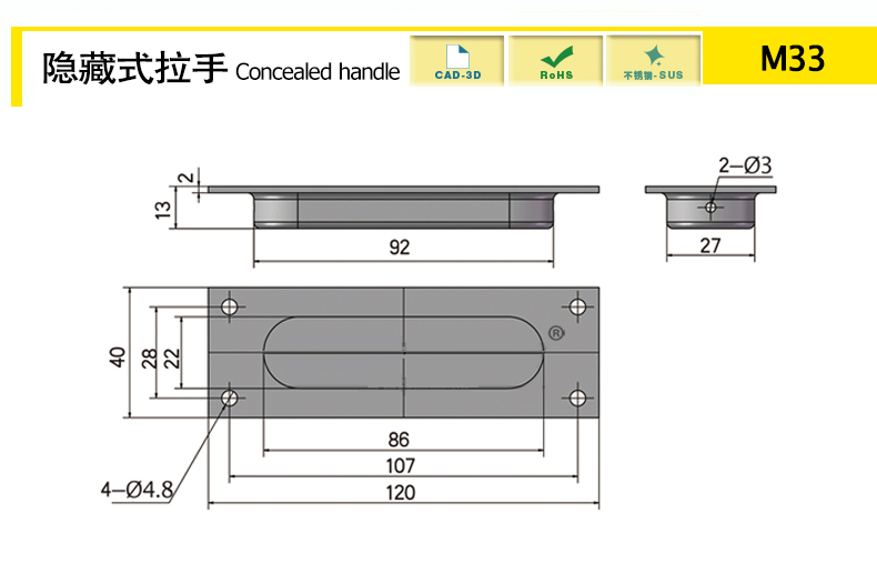 不銹鋼隱藏拉手,不同尺寸不同形狀可選,安裝孔可隱藏、暴露