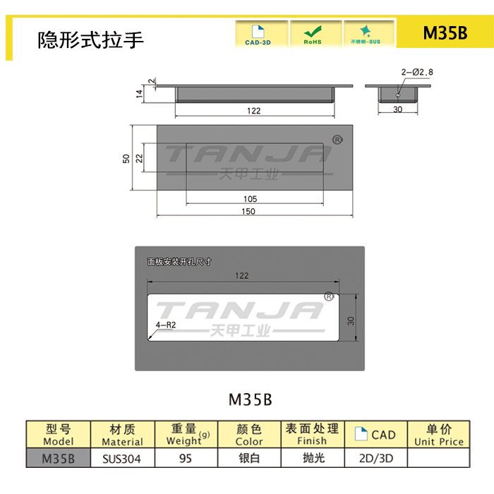 不銹鋼隱藏拉手,不同尺寸不同形狀可選,安裝孔可隱藏,暴露