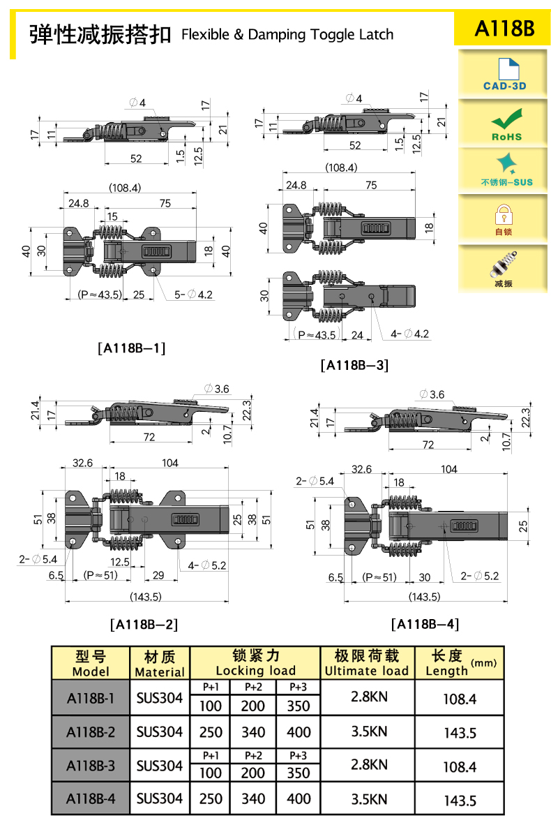 | A118B-2 | 143.5 | SUS304 | 174.81 | 250/340/400 | 3500 | 減振,自鎖 | 下載 | ||||