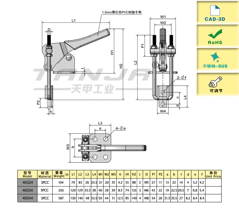 長度(mm) 長度(mm) 材質(zhì) 材質(zhì) 重量(g) 鎖緊力(N) 鎖緊力(N) 極限荷載(N) 極限荷載(N) 功能 功能