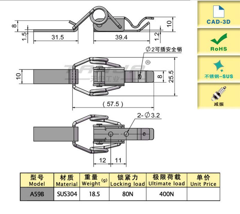 長度(mm) 長度(mm) 材質(zhì) 材質(zhì) 重量(g) 鎖緊力(N) 鎖緊力(N) 極限荷載(N) 極限荷載(N) 功能 功能