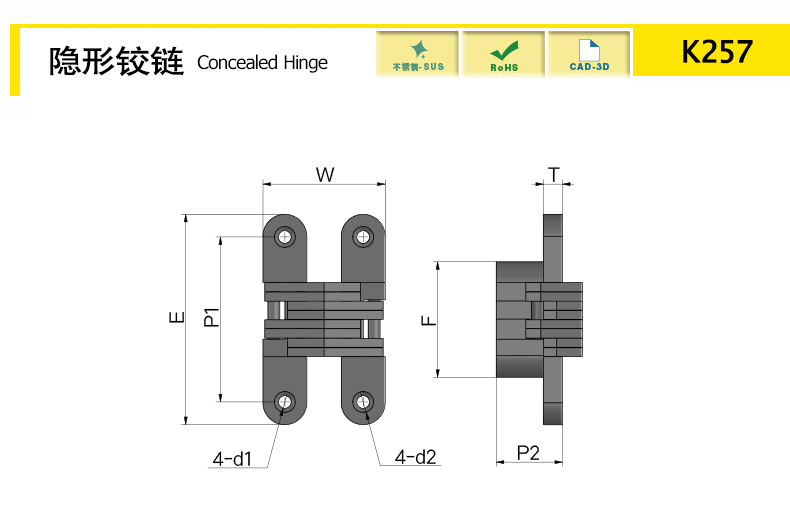 | 型號 | F ![]() | E ![]() | 材質(zhì) ![]() | 長度(mm) ![]() | 顏色 ![]() | 重量(g) | W ![]() | P1 ![]() | P2 ![]() | d1 ![]() | d2 ![]() | T ![]() | 功能 ![]() |