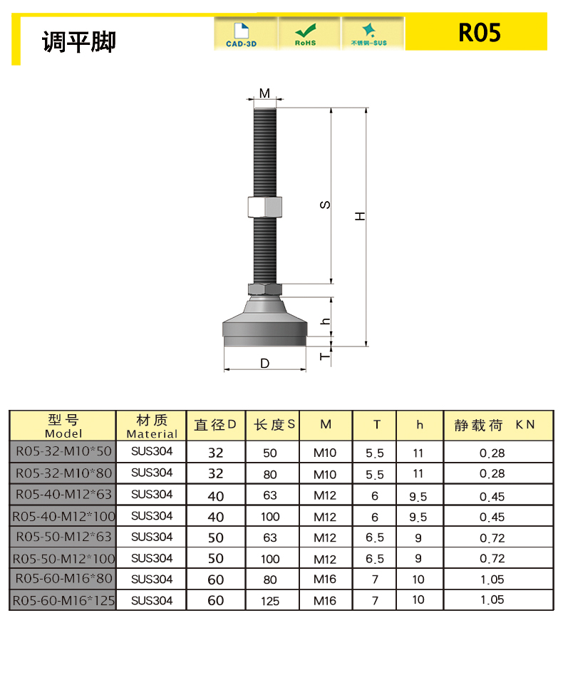 | R05B-32-M10-50 | SUS304 | 32 | M10 | 50 | 11 | 1 | 0.28 | 下載 | ||||