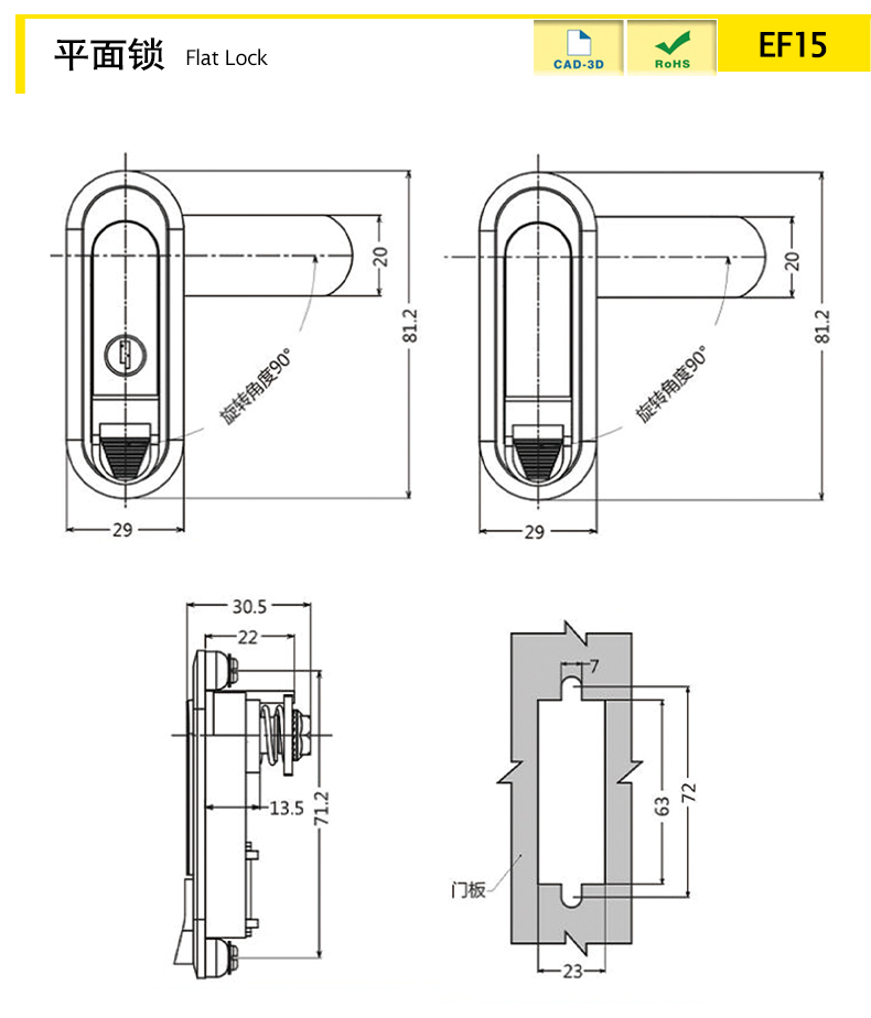 結(jié)構(gòu)功能:通過鑰匙鎖閉,按下把手自動(dòng)彈起、旋轉(zhuǎn)把手開啟,可調(diào)換鎖片位置左右通用